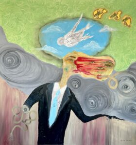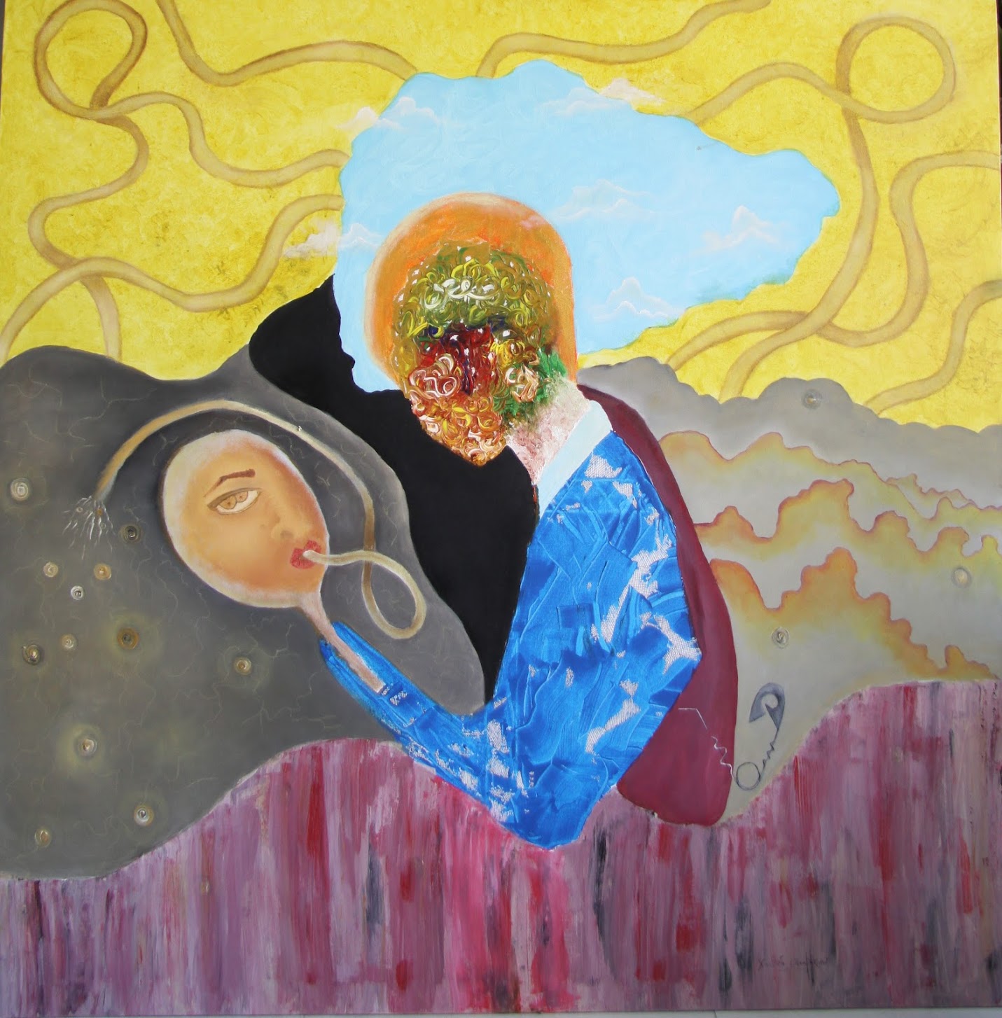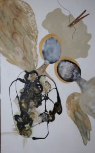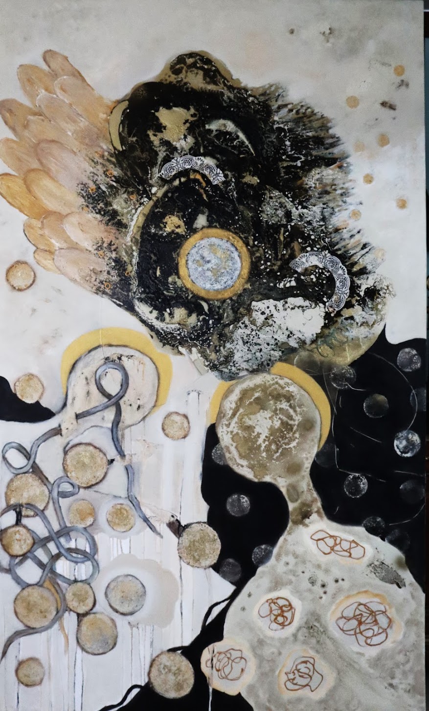 A heightened sensory perception allows me to translate everyday reality into optical energy fields which are then translated to a visual format. All energy patterns stem from a cyclical motion of thought and action. Auras are sucked in, churned and then expelled or emanated, dissolving into other energy fields creating altered states of being. The incessant use of monks, spiral and circular patterns try to chalk out the attraction and dissolution of energy fields between any two entities, whether metaphysical or celestial in esoteric energy patterns. In this instance it forges and infuses an aura of positive energy into the stratosphere. The open safety pin symbolising possibilities and eventualities that hang unanswered; with the possibility of conjoining, forming a union or of getting unhinged or tearing apart. The works pick threads from my poem ” Angel wings brush past sitting on your shoulder” The works reflect chaos with a prayer on angel wings with the hope for a better tomorrow.